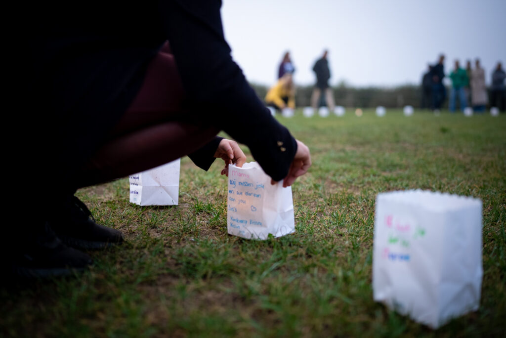 Halverwege stonden we stil. We schreven boodschappen van hoop, de namen van wie we herdenken of waarvoor we meeliepen op een zak. Deze zakken plaatsten we om een kaars, waardoor een hart van licht ontstond. Terwijl de klanken van een doedelzak zacht over het veld zweefden, voelden we de kracht van samen zijn.